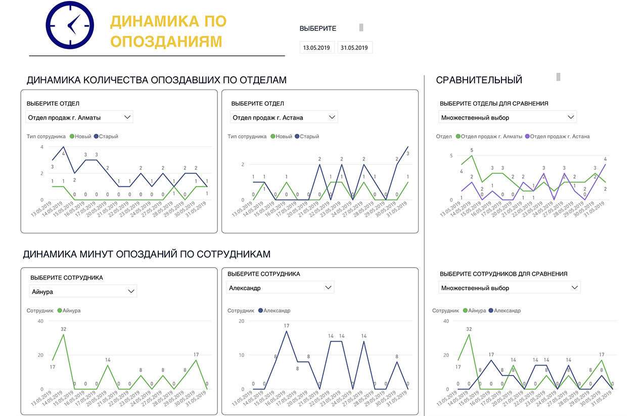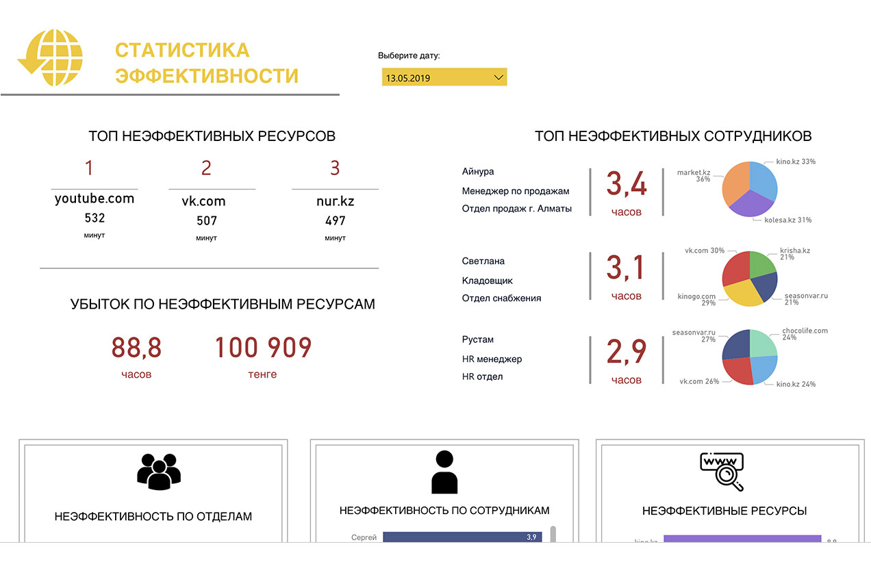 Наглядно на графиках увидите, чем занимается компания, сколько уходит денег на неэффективных сотрудников, на каких сайтах они проводят время. Благодаря таким графикам, вы поймете, почему цель компании не была достигнута в срок, а финансовые отчеты покажут, сколько денег теряет компания.
